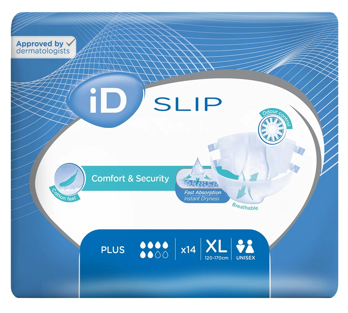 iD Slips Plus von Ontex sind Windelhosen für Erwachsene, haben eine atmungsaktive TBS Außenfolie und bieten einen optimalen Schutz bei mittlerer bis schwerer Inkontinenz. Ihre starke Saugleistung sowie der effektive Auslaufschutz bieten höchste Sicherheit und Komfort. Die ID Slips werden besonder für Peronen mit eingeschränkter Mobilität und bettlägerigen Personen empfohlen.