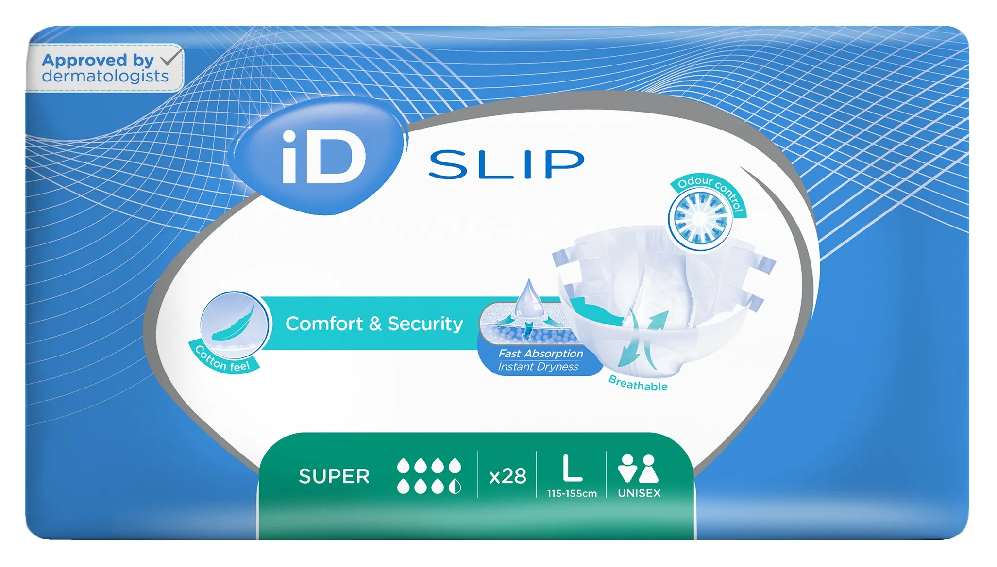 iD Slips Super von Ontex sind Windelhosen für Erwachsene, haben eine atmungsaktive TBS Außenfolie und bieten einen optimalen Schutz bei mittlerer bis schwerer Inkontinenz. Ihre starke Saugleistung sowie der effektive Auslaufschutz bieten höchste Sicherheit und Komfort. Die ID Slips werden besonder für Peronen mit eingeschränkter Mobilität und bettlägerigen Personen empfohlen.