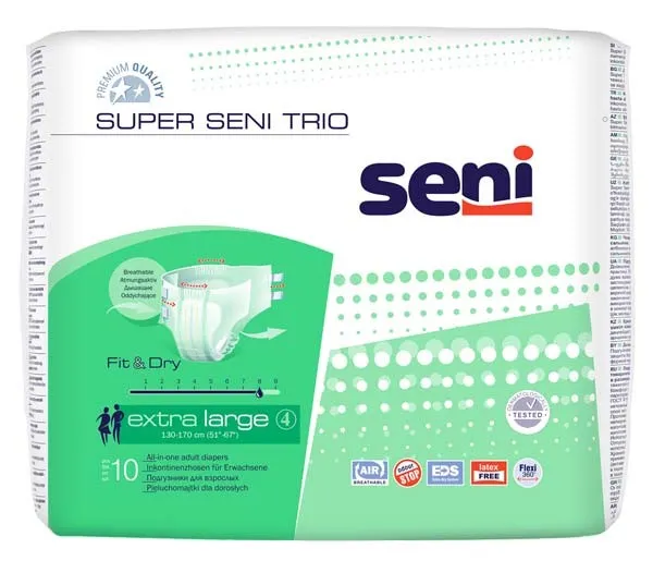 Die Super Seni Trio sind atmungsaktive Windelhosen für mobile und bettlägerige Menschen mit schwerer bis sehr schwerer Inkontinenz. Sie sind optimal für die Nacht geeignet und können sowohl bei Harninkontinenz als auch Stuhlinkontinenz eingesetzt werden.