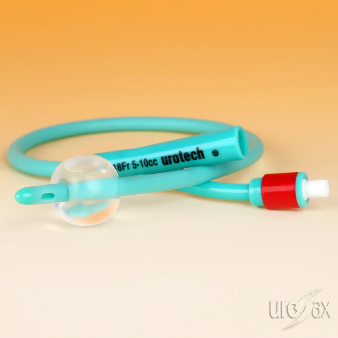 Steriler grüner 2-Weg-Ballonkatheter aus Silikon mit gerader Hohlspitze (Nelaton), 2 Augen, 1 Katheterstopfen und integriertem Ballon. Der Katheter ist weich, hat eine Länge von 40 cm, eine Ballonkapazität von 5 bis 10 ml bei den Größen CH 16 bis CH 26. Die Größen CH 12 und CH 14 haben eine Ballonkapazität von 5 ml. Der Katheter hat eine hervorragende Gewebeverträglichkeit, eine geringe Inkrustationsneigung und wird in der Blase sicher fixiert.